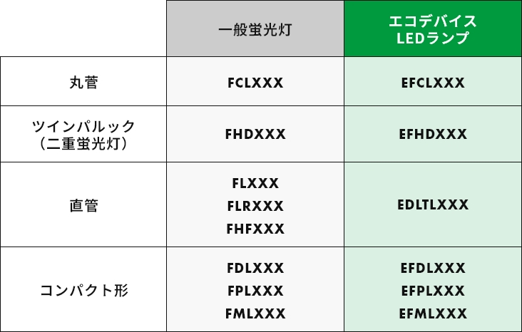 蛍光灯とエコデバイスLEDランプの商品型番を下記の通り照合いただければ、蛍光灯からLEDランプへ交換が容易です。
